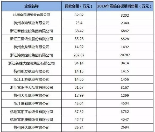 被處罰的造紙企業2016年銷售白板紙7億多,